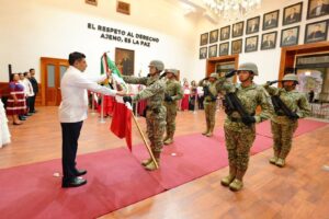 Recibió la Bandera Nacional de manos de la Escolta del Ejército Mexicano, para luego repicar la campana -símbolo del llamado a la lucha independentista- y ondeó el Lábaro Patrio, que fue respondido con el júbilo de las y los presentes.