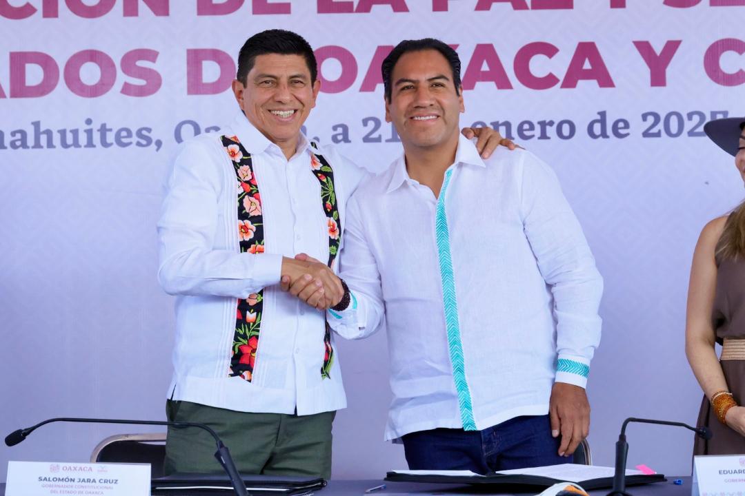 Chahuites, Oax. 21 de enero de 2025.- En el marco de la colaboración interestatal, los gobernadores de Oaxaca y Chiapas, Salomón Jara Cruz y Eduardo Ramírez Aguilar, respectivamente; firmaron el convenio Marco de Coordinación y Colaboración Intergubernamental de Acciones en Materia de Seguridad, a fin de promover una cultura de paz y bienestar a las comunidades limítrofes de ambas entidades.