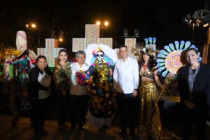 Ahí apreciaron la colocación del altar monumental, cuya reseña estuvo a cargo de la cronista del municipio, Virginia Alicia Ruiz Medina; así como la inauguración de la Ruta al Mictlán, donde se exhiben 22 dragones, gárgolas y demás seres fantásticos del maestro artesano “Temo, el señor de los dragones”, y el mural “Comparsa la original”.