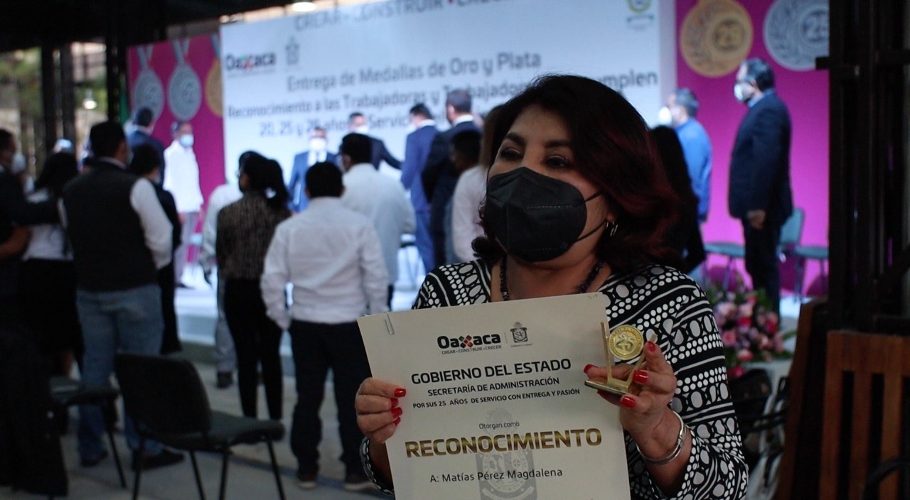 Magdalena Matías Pérez, del Servicio Nacional de Empleo de la Secretaría de Economía, que fue galardonada con una medalla de oro por 25 años de servicio. “Agradezco al Gobernador por otorgarnos este reconocimiento, por poner atención a nosotros, ya que somos el motor del gobierno de Oaxaca”, comentó.
