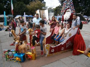 Portando el vestir clásico de Santa Clauss, color rojo, largas barbas, anteojos y llamativo gorro, además de llevar en las manos y hacer tocar pequeña campanita, es el atractivo particularmente de los pequeños, quienes acompañados de sus padres, observan escenas donde se presentan figuras de algunos animales y un trineo.