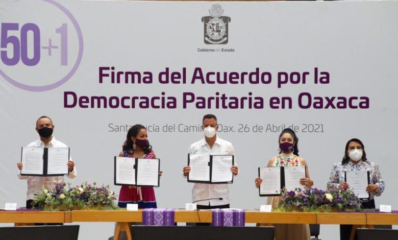 El gobernador Alejandro Murat Hinojosa, firmó este lunes 25 el Acuerdo por la Democracia Paritaria con el Colectivo 50+1 Oaxaca para llevar a cabo en un ambiente de paz y tranquilidad este proceso electoral, considerado el de mayor trascendencia en el país.