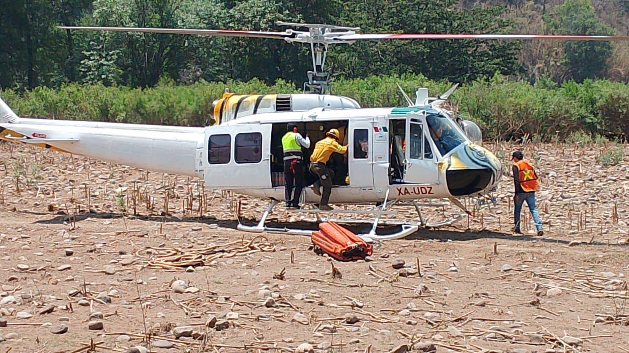 A las labores de combate se sumó la aeronave de la administración estatal BELL UH-1H, la cual realizó vuelos de reconocimiento para facilitar un ataque eficiente al fuego, así como descargas de agua en los frentes más activos de este incidente.
