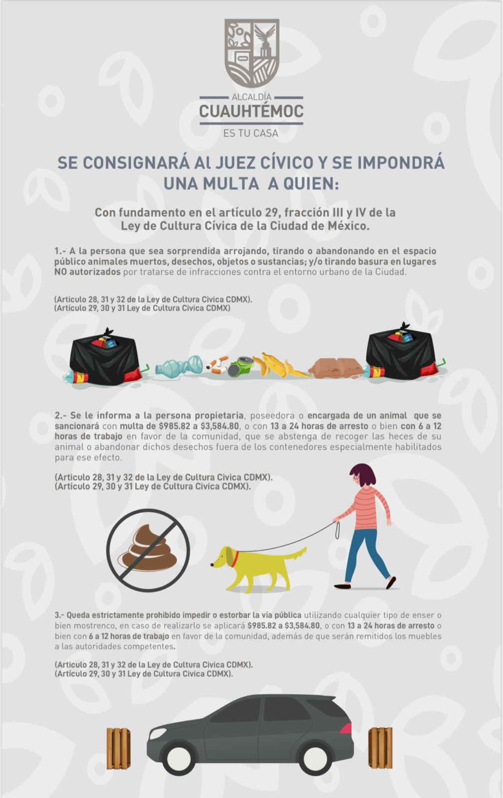 La campaña “Limpiando Cuauhtémoc” implica tres mensajes básicos que establecen que se consignará al Juez Cívico y se impondrá una multa a quien: