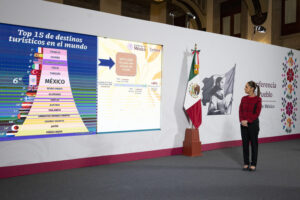 La doctora Claudia Sheinbaum Pardo, presidenta Constitucional de los Estados Unidos Mexicanos en conferencia de prensa matutina, “Conferencia del Pueblo”, en el Salón Tesorería de Palacio Nacional. La acompañan Josefina Rodríguez Zamora, Secretaria de Turismo y Bulmaro Juárez Pérez, divulgador de lenguas indígenas, presentador de la sección “Suave Patria”.