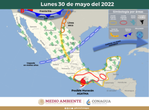 El huracán «Agatha» se ha intensificado a categoría 2 en la escala Saffir-Simpson, informó la Coordinación Regional de Protección Civil luego de su sesión en Puerto Escondido, Oaxaca, e indicó que el fenómeno se localizó a las 16:00 horas de este domingo a 295 Km al suroeste de Puerto Ángel, Oax. y a 245 km al sur-suroeste de Punta Maldonado, Guerrero y se desplaza lentamente hacia el norte a razón de 2 Km/h, con vientos máximos sostenidos de 175 kilómetros por hora (Km/h) y rachas de 215 Km/h.