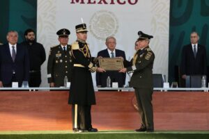 Agradeció el apoyo que su gobierno ha recibido del Ejército y de la Fuerza Aérea e indicó, porque le consta, la lealtad de las Fuerzas Armadas a las causas del pueblo y de la nación, felicitó a todas, a todos por este histórico día, y por el cumplimiento del deber de soldados, oficiales, jefes, generales, comandantes de zonas y regiones, “y en especial mi reconocimiento por su entrega y honestidad al general secretario de la Defensa, Luis Cresencio Sandoval González”.