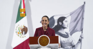 La doctora Claudia Sheinbaum Pardo, presidenta Constitucional de los Estados Unidos Mexicanos en conferencia de prensa matutina, “Conferencia del Pueblo”, en el Salón Tesorería de Palacio Nacional. La acompañan Delfina Gómez Álvarez, gobernadora del Estado de México; Jesús Antonio Esteva Medina, secretario de Infraestructura Comunicaciones y Transportes; Edna Vega Rangel, secretaria de Desarrollo Agrario, Territorial y Urbano; Mario Delgado Carrillo, secretario de Educación Pública; Rosaura Ruiz Gutiérrez, secretaria de Ciencia, Humanidades, Tecnología e Innovación; Efraín Morales López, director general de la Comisión Nacional del Agua (Conagua); Zoé Robledo Aburto, director general del Instituto Mexicano del Seguro Social (IMSS); Alejandro Svarch Pérez, director general del IMSS Bienestar.
