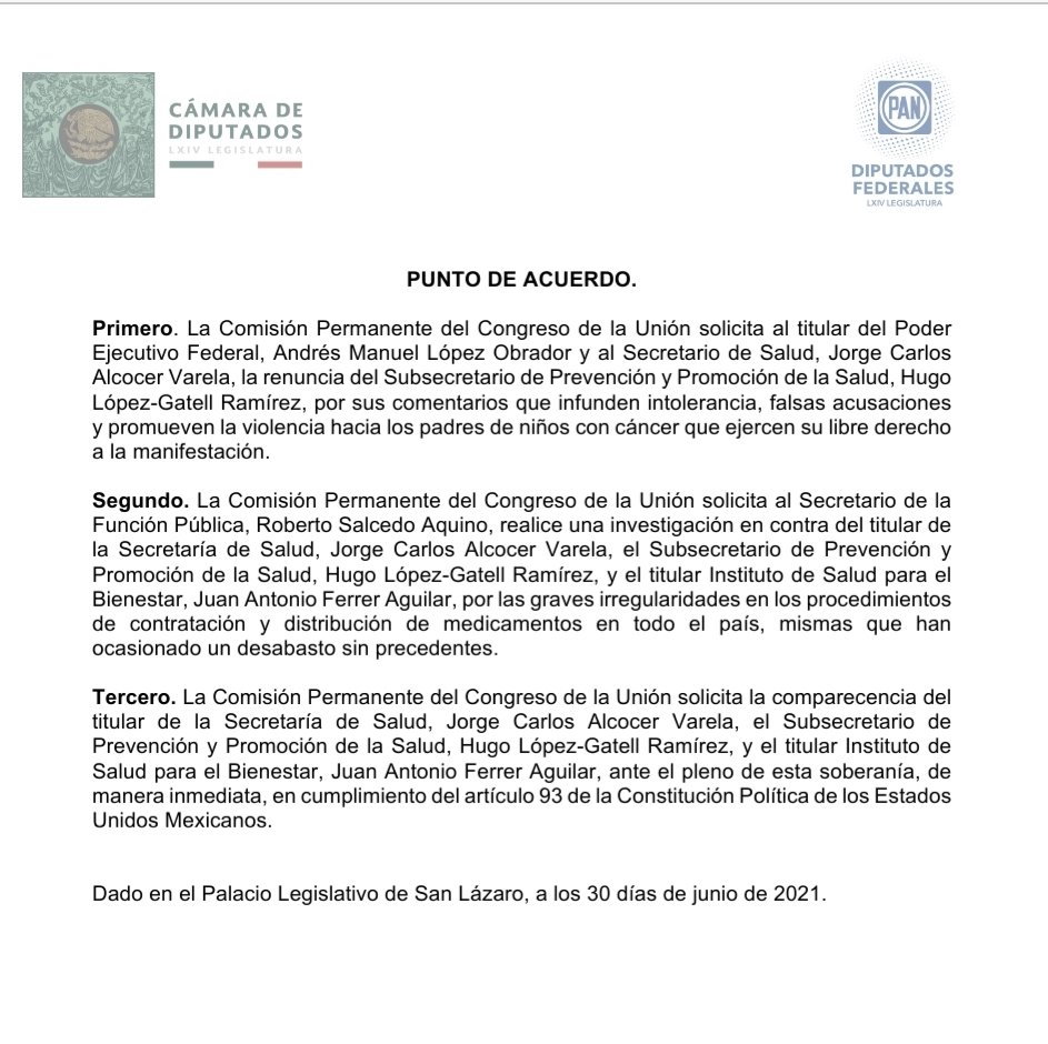 En la Comisión Permanente del Congreso solicitaremos la renuncia del Subsecretario Hugo López-Gatell, por sus comentarios que infunden intolerancia, falsas acusaciones y promueven la violencia hacia los padres de niños con cáncer que ejercen su libre derecho a la manifestación informó el Grupo Parlamentario del PAN.