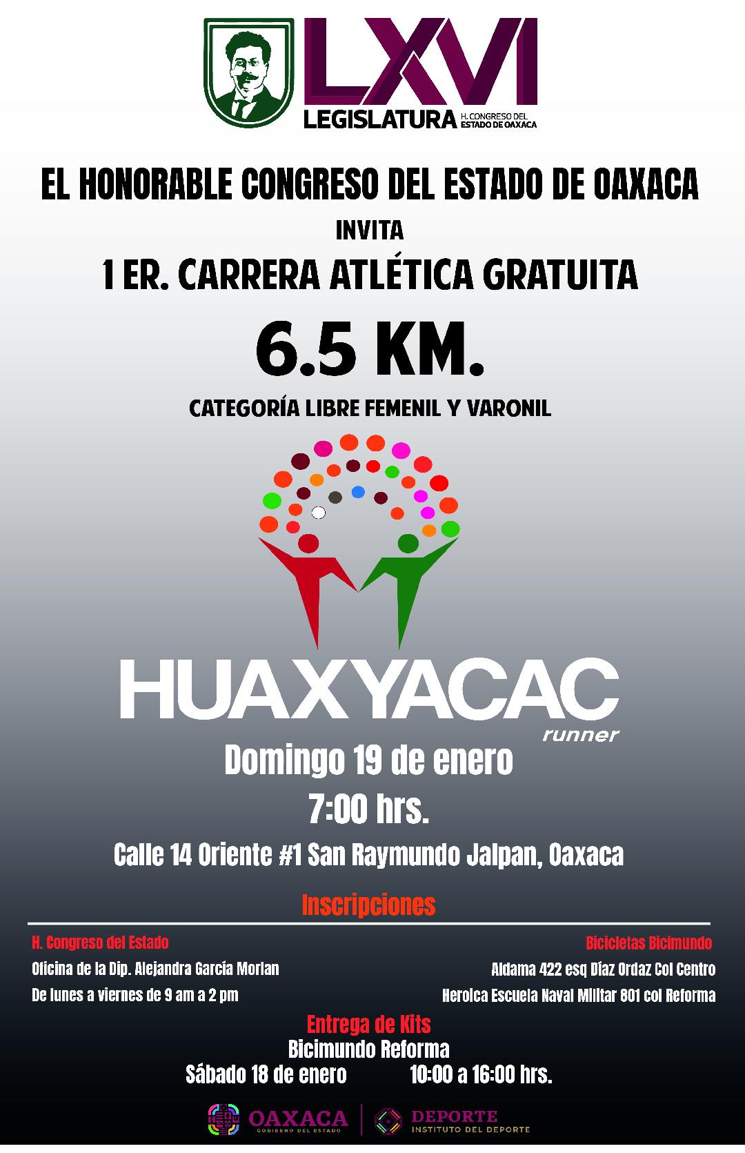 San Raymundo Jalpan, Oax., a 13 de enero de 2025.- Para fomentar la unión y participación de la comunidad oaxaqueña mediante la actividad deportiva, el Congreso del Estado a través de la Comisión Permanente del Deporte y el Instituto del Deporte del Gobierno estatal invitan a la población a participar de manera gratuita a la primera Carrera Atlética “Huaxyacac”, que se llevará a cabo el próximo 19 de enero.Esta acción también tiene el propósito de mostrar la cercanía entre el Poder Legislativo con la ciudadanía, promover hábitos saludables que favorezcan la salud física y mental de las y los oaxaqueños.