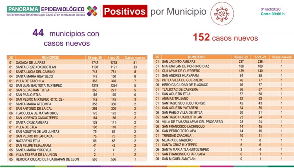 Refirió que los 152 casos nuevos de este día, se registran en 44 municipios, siendo el que mayor número presenta: Oaxaca de Juárez con 51, Santa Cruz Xoxocotlán 13, Santa Lucía del Camino y Santa María Huatulco ocho cada uno, Villa de Zaachila siete, San Juan Bautista Tuxtepec, San Sebastián Tutla y San Pablo Etla cinco cada uno, el resto tres, dos y un caso.