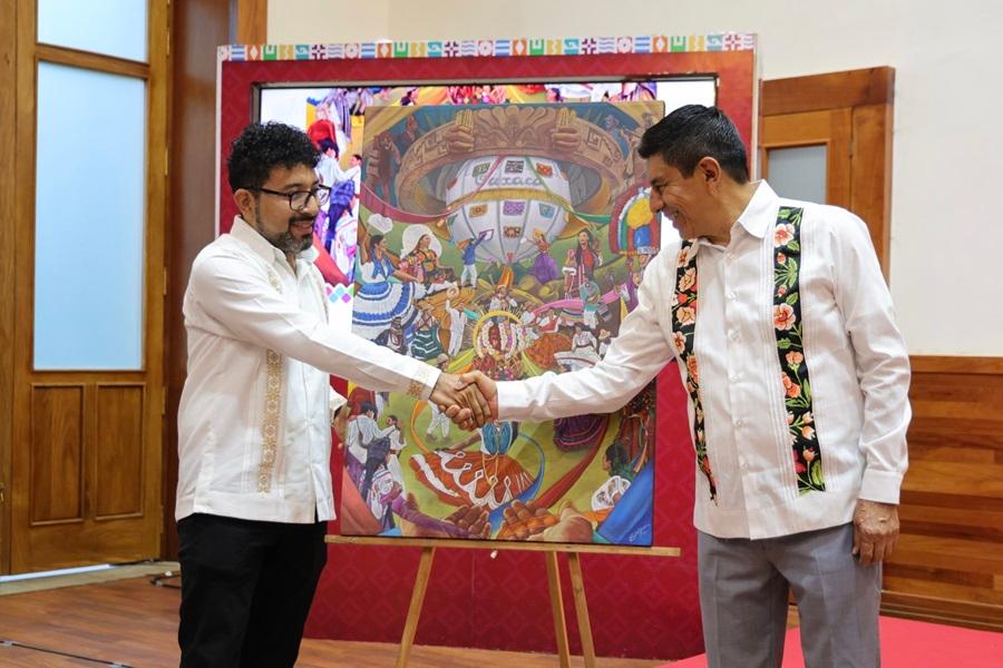 En conferencia de prensa, el gobernador destacó la técnica y creatividad del artista istmeño oriundo de Chicapa de Castro, para plasmar la cosmovisión de la máxima fiesta de las y los oaxaqueños, que se llevará a cabo el 21 y 28 de julio, edición 93.
